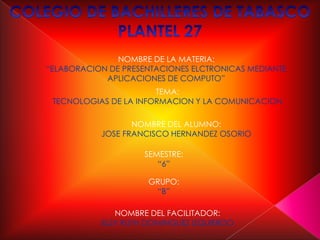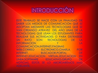 Este documento describe varias tecnologías de la información y la comunicación que se pueden usar para crear presentaciones electrónicas, incluyendo Internet, páginas web, correo electrónico, chat, buscadores, portales de Internet, educación virtual, educación en línea, software educativo y grupos de noticias. El objetivo es pasar la materia de elaborar presentaciones electrónicas mediante aplicaciones de computadora.