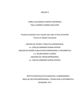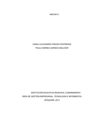 Este documento presenta el plan de negocio de Aricoks, una empresa dedicada a la producción y comercialización de arequipes y cocadas. En primer lugar, se describe el proceso de generación de la idea de negocio, incluyendo una lluvia de ideas y la evaluación y selección de la idea final. Luego, se presenta el marco de referencia del proyecto y la planificación estratégica, que incluye un análisis del entorno, la empresa, el producto y las estrategias de mercadeo. Finalmente, se detallan los planes