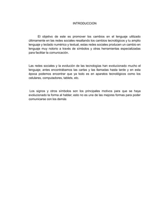 Este documento analiza cómo las redes sociales y la tecnología han influido en la evolución del lenguaje, particularmente a través del uso de abreviaturas, símbolos y emoticonos. Si bien estas nuevas formas de comunicación pueden facilitar la interacción, también han cambiado la escritura tradicional y debilitado la ortografía. El documento concluye que el impacto de las redes sociales en el lenguaje depende de cómo se utilicen, pero que la tecnología sin duda ha revolucionado la forma en que