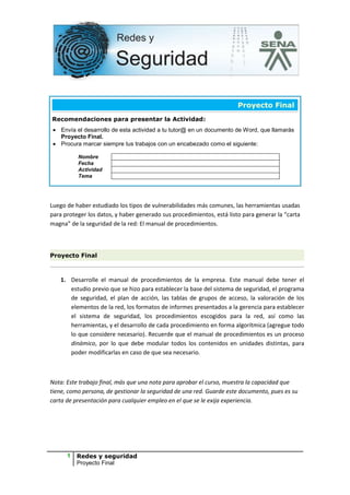 El documento proporciona instrucciones para completar un proyecto final sobre un manual de procedimientos de seguridad de red. Se pide al estudiante que desarrolle el manual detallando el estudio previo de seguridad realizado, el programa de seguridad, el plan de acción, las tablas de grupos de acceso, la valoración de activos de red, los formatos de informes para la gerencia y los procedimientos de seguridad seleccionados en un formato algorítmico modular. El manual servirá como evidencia de la capacidad del estudian