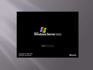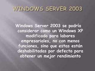 Este documento compara Windows Server 2003 y Windows Server 2008. Windows Server 2003 es básicamente una versión de Windows XP optimizada para servidores, con funciones deshabilitadas de forma predeterminada para un mejor rendimiento. Windows Server 2008 es el sucesor de Windows Server 2003, basado en el núcleo Windows NT 6.0. También describe los pasos para instalar Windows Server 2003 Enterprise, incluida la partición y formateo del disco, instalación del sistema operativo, configuración de la región, idioma y nombre de la empresa, y configuración de la red.