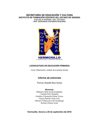 Este documento trata sobre una entrevista realizada por estudiantes normalistas acerca de la reforma educativa. Se entrevistó a varias personas en un parque para conocer sus perspectivas sobre este tema. Algunos entrevistados conocían aspectos generales de la reforma educativa, como que propone fortalecer la educación y destinar más recursos a zonas pobres. Otros no sabían nada o tenían opiniones vagas. Los estudiantes normalistas diseñaron la entrevista para indagar sobre el conocimiento, opiniones, ventajas y desventajas de