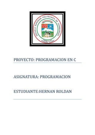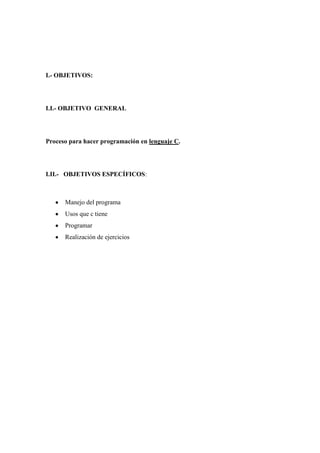 El documento describe un proyecto de programación en lenguaje C. Los objetivos generales son aprender el proceso de programación en C y los objetivos específicos son manejar programas en C, aprender sus usos y realizar ejercicios de programación. Se justifica la importancia de conocer C debido a que es la base de muchos sistemas operativos y programas y permite entender y desarrollar en este lenguaje ampliamente utilizado.