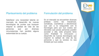 Este documento presenta un proyecto para desarrollar prótesis electromecánicas de bajo costo para mejorar la calidad de vida de personas con discapacidad. El proyecto justifica la necesidad de prótesis asequibles, describe los objetivos y análisis de mercado realizados, y explica cómo se producirán y comercializarán las prótesis de manera técnica y económicamente viable.