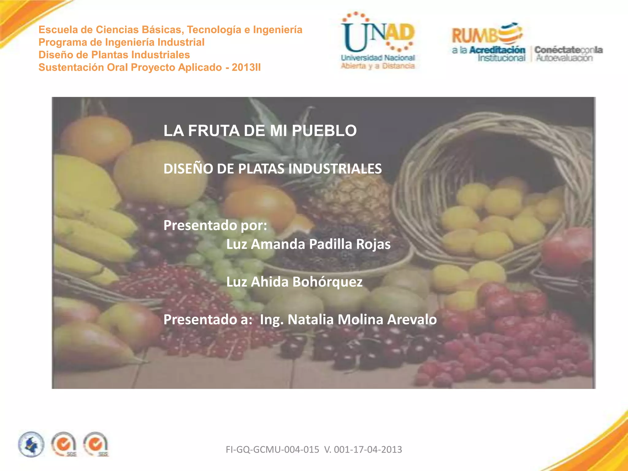Este documento presenta el diseño de una planta industrial para la empresa "La Fruta de Mi Pueblo" dedicada a procesar pulpa de frutas. Incluye una descripción de la empresa y sus productos, un diagrama de procesos, y diseños de las áreas de planeación, embarque/desembarque/almacenamiento, producción y la planta general. El objetivo es optimizar los procesos, tiempos y espacios para cumplir con la misión de procesar pulpa de fruta de manera eficiente.