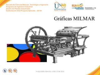 El documento presenta el proyecto final del grupo 9 del curso de diseño de plantas industriales en la Universidad Nacional Abierta y a Distancia, abarcando la elaboración de un Objeto Virtual de Información sobre los procesos de una empresa manufacturera llamada Gráficas Milmar. Se detallan los diferentes subprocesos de producción para la fabricación de tarjetas de presentación, incluyendo la planificación del área de producción, el sistema logístico y la administración de materiales. A través de trabajos colaborativos, los estudiantes aplicaron sus conocimientos para optimizar los recursos y maximizar la satisfacción del cliente en el contexto de la ingeniería industrial.