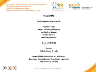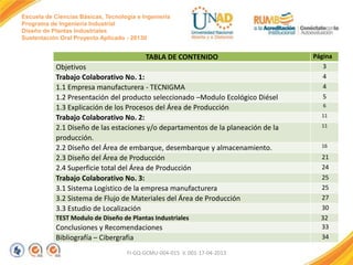 El documento presenta el diseño del área de producción de la empresa TECNIMAG, incluyendo la distribución de las estaciones de trabajo, como corte, doblado y soldadura. También describe el diseño del área de embarque, desembarque y almacenamiento, con secciones para materiales, productos terminados y despachos. Finalmente, explica los objetivos del proyecto aplicado de diseño de plantas industriales para esta empresa.
