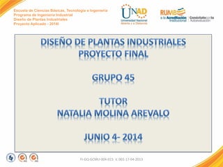 Este documento presenta el proyecto aplicado de diseño de plantas industriales de 2014 para el programa de ingeniería industrial. Contiene tres trabajos colaborativos que incluyen la presentación de una fábrica de calzado, el diseño de su planta productiva mediante diagramas de procesos y planos, y el estudio de su sistema logístico y de flujo de materiales. Finalmente, se presentan las conclusiones sobre los conocimientos adquiridos en el curso aplicando herramientas de diseño.