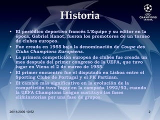 La Liga de Campeones de la UEFA fue creada en 1955 como una competición europea de clubes. Ha evolucionado desde entonces, adoptando un formato de fase de grupos en 1992-93 y ampliando la participación de clubes. El Real Madrid posee el récord de títulos ganados con 13, seguido de cerca por el Milan y Liverpool.