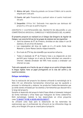 Este documento describe un proyecto escolar sobre países de habla inglesa. Los estudiantes crearán guías turísticas digitales sobre un país seleccionado que incluirán información geográfica, histórica, sobre la cultura y atracciones. Trabajarán individualmente y en grupos utilizando herramientas digitales como Google Docs, Maps y YouTube. El objetivo es que aprendan sobre la cultura y el idioma inglés mientras desarrollan habilidades con la tecnología y el trabajo colaborativo.