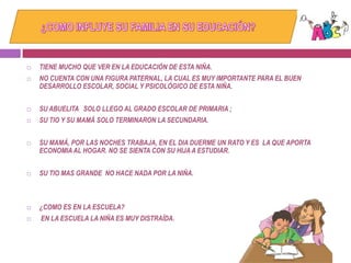 Esta niña de 7 años vive en una familia disfuncional con su tío de 25 años, otro tío de 12 años, su "mamá" y su "abuelita". No cuenta con figuras paternas importantes y su entorno familiar no le brinda el apoyo adecuado para su desarrollo. Presenta problemas en el lenguaje y en las habilidades académicas. Se recomiendan estrategias como mejorar la comunicación con ella, estimularla con juegos y asegurar una alimentación adecuada.
