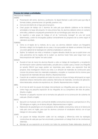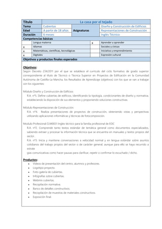 Este documento describe un proyecto eTwinning sobre cubiertas de edificios que involucra a estudiantes de varios países. El proyecto se llevará a cabo durante 6 meses y los estudiantes trabajarán en grupos internacionales para crear infografías, fotos, videos y una exposición final sobre tipos de cubiertas. El proyecto ayudará a los estudiantes a desarrollar habilidades en diseño, construcción, representación e inglés técnico.