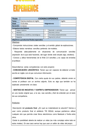 Este documento describe un proyecto de 6 meses sobre cocina creativa en inglés para estudiantes de 9-10 años. El objetivo es que los estudiantes aprendan vocabulario culinario en inglés y creen recetas originales para incluir en un libro digital. Los estudiantes trabajarán individualmente y en colaboración con otros colegios europeos a través de herramientas TIC para compartir y comentar sus recetas.