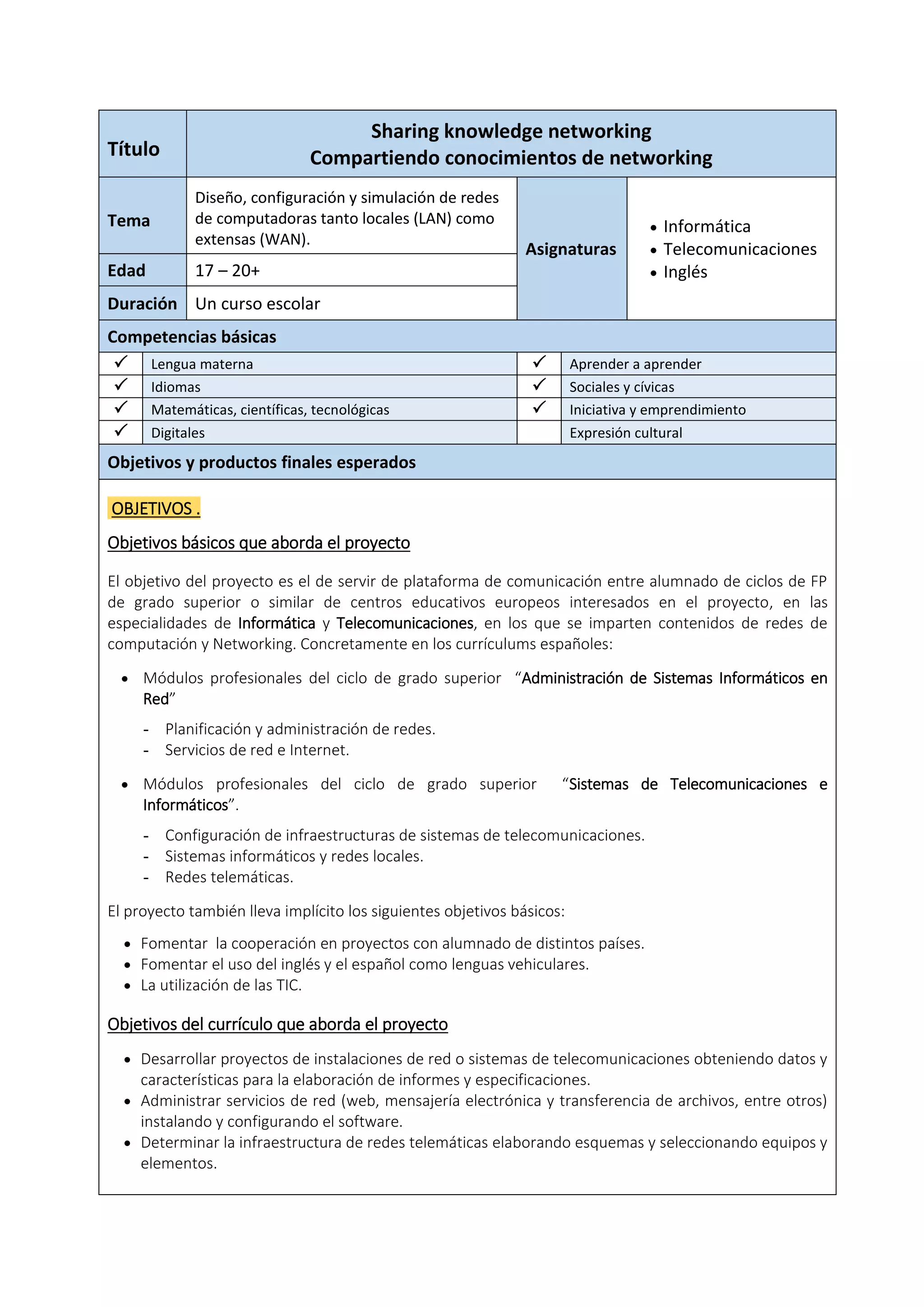 El documento detalla un proyecto educativo sobre diseño, configuración y simulación de redes de computadoras, dirigido a estudiantes de ciclo formativo de grado superior en informática y telecomunicaciones. El objetivo principal es fomentar la comunicación y colaboración entre alumnos de diferentes países europeos mediante la enseñanza práctica en redes, utilizando herramientas TIC y desarrollando e-actividades. Los participantes crean presentaciones, blogs y documentos finales para reflexionar sobre su proceso de aprendizaje y el impacto del proyecto en su formación.