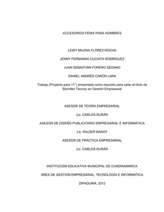 El documento presenta una propuesta de negocio para la creación de una empresa de accesorios para hombres llamada Fénix. Inicialmente se generaron 20 ideas de negocio que fueron valoradas según criterios como recursos, mercado y factibilidad. Como resultado de este análisis, la idea de Accesorios Fénix fue seleccionada para el desarrollo del plan de negocio.