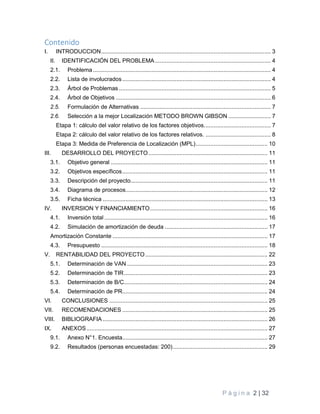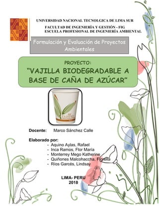 Este documento presenta un proyecto para la producción y comercialización de una línea de platos y vasos biodegradables hechos a base de caña de azúcar. El proyecto busca reducir la contaminación por plásticos y ofrecer una alternativa sostenible. Se realizó un estudio de factibilidad que incluyó la identificación del problema, formulación de objetivos, análisis de alternativas y selección de la mejor ubicación usando el método de Brown Gibson. El proyecto propone el desarrollo, producción y com