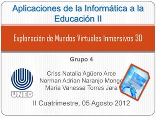 Este documento resume las exploraciones de mundos virtuales 3D realizadas por un grupo de estudiantes en Second Life. Visitaron lugares como la galería de arte de Lin, Edutopia para asistir a clases, e islas de la NASA. Analizaron las características y usos educativos potenciales de Second Life. Concluyeron que, si se cuenta con la infraestructura y se seleccionan bien los recursos, los mundos virtuales pueden enriquecer el aprendizaje al romper barreras y fomentar la interacción y construcción de conocimiento