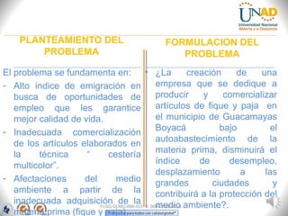 El documento propone crear una empresa en Guacamayas, Boyacá, para producir y comercializar artículos de fique y paja. Actualmente hay alto desempleo y emigración debido a la falta de oportunidades. La empresa aprovecharía la experiencia local en cestería multicolor de manera sostenible. El objetivo es reducir el desempleo y emigración mientras se protege el medio ambiente.