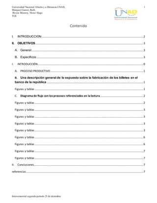 Este documento presenta un resumen de la Teoría General de Sistemas y su aplicación al análisis del proceso de producción de billetes en el Banco de la República de Colombia. Se identifican claramente los elementos que conforman este sistema abierto y se describe detalladamente cada uno de los procesos involucrados en la fabricación de billetes, desarrollando diagramas de flujo. La Teoría General de Sistemas provee una metodología útil para comprender y modelar este tipo de sistemas productivos, reconociendo las interacciones entre sus partes y el