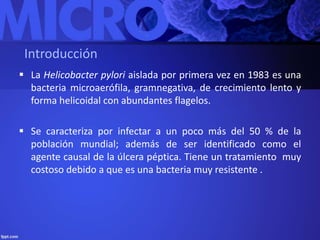 La Helicobacter pylori es una bacteria gramnegativa que infecta a más del 50% de la población mundial, siendo responsable de úlceras pépticas y otras complicaciones gastrointestinales. La infección, que se adquiere principalmente en la infancia y tiene alta prevalencia en países en desarrollo, puede ser asintomática y su tratamiento es complicado debido a la resistencia a antibióticos. La prevención incluye medidas de higiene como el lavado de manos y el consumo de alimentos bien limpios.