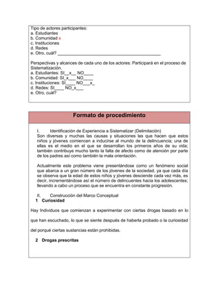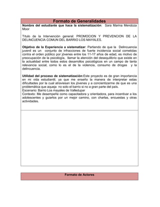 Este documento describe un proyecto para promover la prevención de la delincuencia juvenil en el barrio Los Mayales. El objetivo era guiar a los adolescentes por un mejor camino a través de charlas y actividades. La autora trabajó como capacitadora para incentivar a los jóvenes. El proceso incluyó identificar las causas de la delincuencia juvenil, desarrollar un marco conceptual, elegir a los adolescentes como actor principal, e implementar actividades como romper el hielo, escenas teatrales y videos de capacitación.