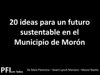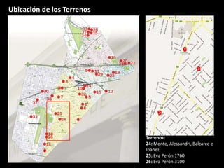 El documento presenta información sobre 3 terrenos ubicados en el Municipio de Morón, incluyendo su ubicación, dimensiones, zonificación, infraestructura circundante y propuestas de usos para cada terreno como un club barrial, un centro de reciclaje y un centro de salud. También resume propuestas generales para la zona como la necesidad de más escuelas, espacios de recreación y deportivos, y centros culturales y de salud.