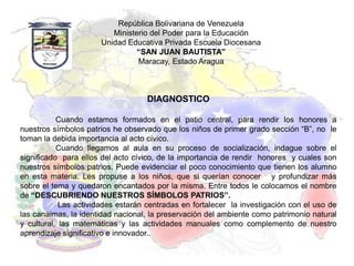 Este documento describe un proyecto educativo para estudiantes de primer grado en la Escuela Diocesana "San Juan Bautista" en Maracay, Venezuela. El proyecto, llamado "Descubriendo Nuestros Símbolos Patrios", tiene como objetivo que los estudiantes aprendan sobre y valoren los símbolos nacionales de Venezuela a través de actividades académicas y manuales.
