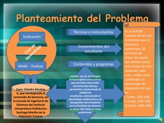 El documento presenta una propuesta de estrategias metodológicas y evaluativas para la cátedra Electiva II de Gerencia en la Escuela de Ingeniería de Sistemas del Instituto Universitario Politécnico Santiago Mariño. La propuesta busca mantener la calidad de la enseñanza, estimular el aprendizaje colaborativo y la autogestión del estudiante, e incorporar evaluaciones que permitan el desarrollo integral del estudiante.