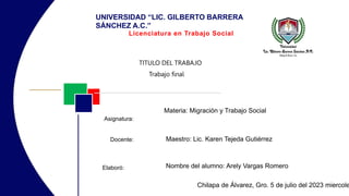 Este documento presenta una introducción a un proyecto de investigación sobre la migración. El autor investigará las razones por las que cuatro personas decidieron emigrar, como reunirse con la familia, encontrar trabajo u oportunidades de estudio, escapar de la violencia o los desastres naturales. Luego, el documento presenta un marco teórico que define la migración y discute las causas y consecuencias de la migración interna e internacional en México. Finalmente, analiza factores como las regiones con mayor migración y los ejemplos histó