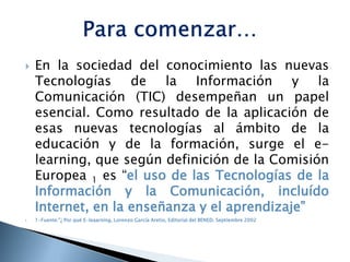 Este documento presenta el nuevo reto docente del e-learning y la metodología PACIE para aplicarlo. Brevemente describe los beneficios del e-learning como flexibilizar tiempos, reducir distancias y ampliar cobertura. Luego detalla los cinco elementos de PACIE (Presencia, Alcance, Capacitación, Interacción y E-Learning) y sus funciones para implementar un complejo educativo virtual exitoso. Finalmente, agradece por la atención del lector.