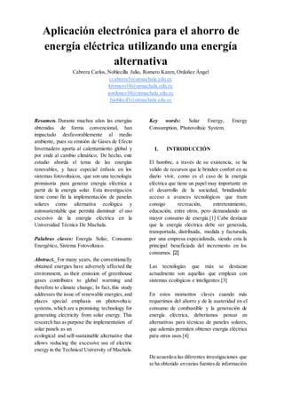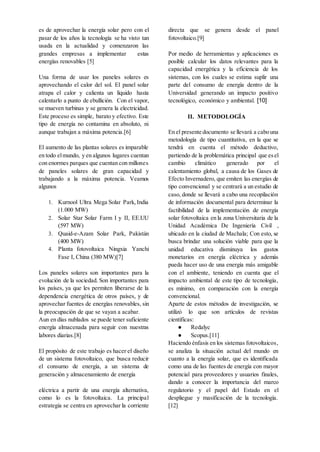 El documento presenta un estudio sobre la implementación de paneles solares en la Universidad Técnica de Machala como una alternativa ecológica para reducir el consumo de energía eléctrica. Se destaca la importancia de la energía solar fotovoltaica en la lucha contra el cambio climático y la reducción de gases de efecto invernadero. Además, se describe la metodología para la creación de un prototipo de panel solar y su impacto potencial en términos tecnológicos, económicos y ambientales.