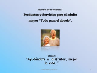 La empresa "Todo para el abuelo" ofrece productos y servicios para mejorar la calidad de vida de las personas de la tercera edad. Su objetivo es satisfacer las necesidades de los adultos mayores y sus familias a través de un excelente servicio. La empresa busca convertirse en líder en el mercado global para este sector de la población, el cual está creciendo rápidamente en México.