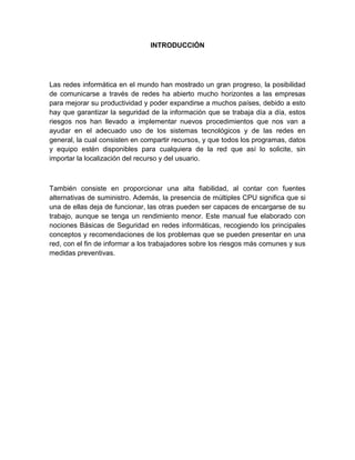 Este documento presenta el proyecto final de Carlos Andrés Pérez Cabrales para el curso de Redes y Seguridad del SENA. El proyecto incluye el desarrollo de un manual de procedimientos de seguridad para una empresa, con secciones como el estudio previo del sistema de seguridad, el programa de seguridad, el plan de acción, la tabla de grupos de acceso, y los procedimientos escogidos para la red. El objetivo es informar a los trabajadores sobre los riesgos comunes en redes y sus medidas preventivas.