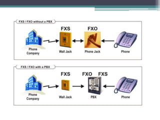 El documento describe un proyecto para implementar una solución de VoIP utilizando Asterisk como software PBX libre para permitir la comunicación entre dos oficinas de una empresa que actualmente usan teléfonos públicos. Explica que Asterisk es un software PBX completo y libre que funciona en Linux y soporta códecs como G.711, G.729 y protocolos como SIP e IAX. También describe tarjetas de hardware como Digium que soportan Asterisk y conceptos como FXS y FXO para conectar líneas telefónicas.