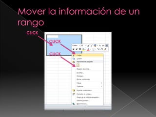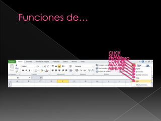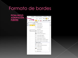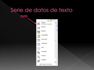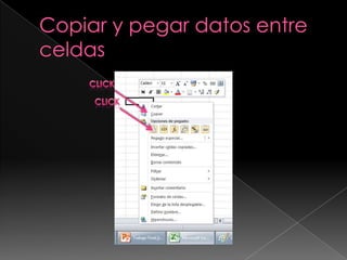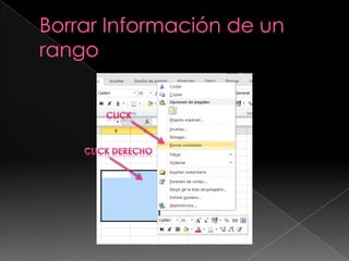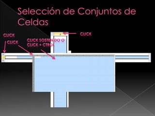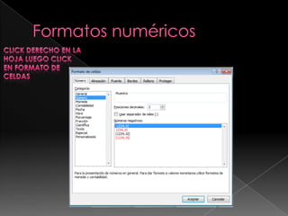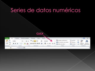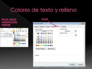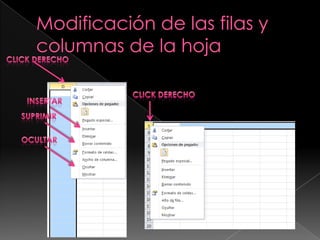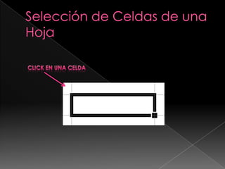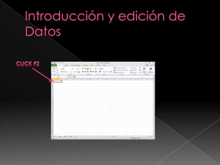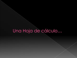 Excel es una aplicación de hoja de cálculo que permite guardar, manipular, calcular y analizar datos numéricos y de texto en celdas organizadas en una tabla. Se pueden usar fórmulas, funciones y gráficos como diagramas de barras y líneas para presentar y resumir la información en dos dimensiones. El archivo de Excel se compone de hojas de cálculo donde se trabaja y de libros que contienen varias hojas.