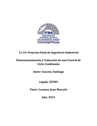 El documento presenta un resumen del proyecto final de ingeniería industrial sobre el dimensionamiento y valuación de una central de ciclo combinado de 800 MW. En primer lugar, realiza una introducción teórica sobre turbinas de gas, vapor y plantas de ciclo combinado. Luego, dimensiona los componentes principales de la planta y proyecta variables macroeconómicas. Finalmente, analiza los costos de construcción y valuación financiera del proyecto bajo dos escenarios de precios.