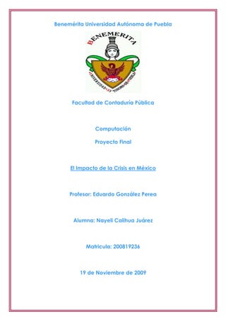 Este documento resume los antecedentes de crisis financieras previas en México desde 1976, cómo surgió la crisis financiera de 2008-2009 debido a factores internos y externos como la desaceleración de la economía estadounidense, y los efectos como la contracción del 7% del PIB mexicano, uno de los mayores descensos a nivel mundial, y el aumento de la desigualdad económica en el país.