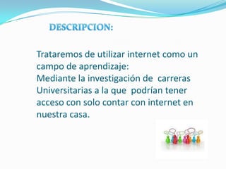 Este documento propone utilizar internet y las redes sociales como herramientas educativas. Los alumnos investigarán carreras universitarias a distancia y crearán presentaciones en PowerPoint con la información encontrada, la cual publicarán en Facebook para comentarla y compartirla con compañeros. La profesora creará un grupo en Facebook para que los alumnos se unan y participen.