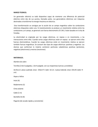 Este documento describe el diseño y construcción de un generador eléctrico que produce energía a través de la corriente alterna y el electromagnetismo sin generar contaminación. El generador consta de bobinas de cobre, imanes y una hélice impulsada por el viento. El prototipo inicial no era estable, pero una versión mejorada con piezas mecanizadas produjo energía eléctrica de forma limpia y sostenible para alumbrar comunidades de bajos recursos.