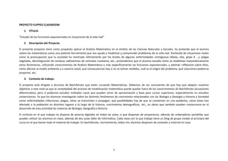 Este documento describe un proyecto de aprendizaje basado en proyectos sobre el uso de funciones exponenciales para modelar fenómenos del mundo real como epidemias y plagas. Los estudiantes investigarán tres temas asignados (una plaga, una enfermedad y el decaimiento radiactivo) y crearán presentaciones que muestren el contexto, el modelo matemático y las conclusiones. El objetivo es que los estudiantes valoren las matemáticas como una herramienta para comprender problemas reales y desarrollen competencias clave a trav