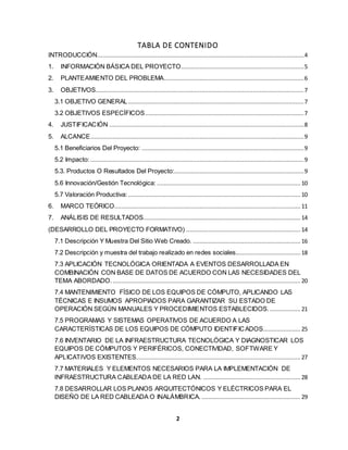El documento describe un proyecto para reparar y mejorar los equipos de cómputo e infraestructura de red de la sala de internet MITAREA.COM, con objetivos como realizar el mantenimiento de los equipos, instalar software, diseñar la red, y configurar dispositivos de red para mejorar la conectividad e intercambio de información. El proyecto busca beneficiar a los usuarios de la sala de internet al resolver problemas tecnológic