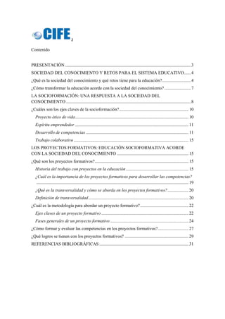 Este documento describe la importancia de los proyectos formativos para la educación en la sociedad del conocimiento. Explica que la sociedad del conocimiento se centra en crear, procesar y aplicar conocimiento para resolver problemas, a diferencia de la sociedad de la información que se enfoca en datos. También introduce el enfoque educativo de la socioformación, cuyos ejes son el desarrollo del proyecto ético de vida, el espíritu emprendedor, las competencias y el trabajo colaborativo a través de proyectos transversales. Finalmente, explic