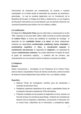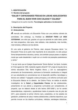 El documento presenta un proyecto educativo para mejorar el control y seguimiento de la salud y capacidades físicas de los adolescentes en un colegio ecuatoriano. El proyecto propone implementar pruebas de diagnóstico periódicas para monitorear el desarrollo físico y estado de salud de los estudiantes, así como crear fichas de investigación y sistemas estadísticos de recolección de datos. El objetivo general es aplicar innovaciones tecnológicas que promuevan un cambio de act