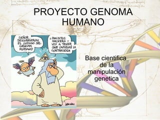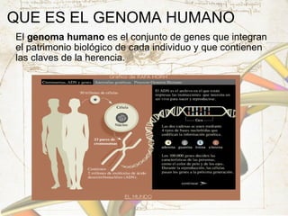 El documento resume la historia del Proyecto Genoma Humano, que comenzó en 1990 con el objetivo de analizar la herencia genética humana. Algunos hitos clave incluyen la determinación de la estructura del ADN en 1953 y la secuenciación completa del genoma humano en 2003. El proyecto busca identificar los genes humanos y su información para comprender enfermedades y mejorar la calidad de vida, aunque plantea implicaciones éticas sobre el uso de esta información genética.