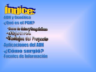 El documento proporciona información sobre el Proyecto Genoma Humano (PGH), incluyendo su objetivo de secuenciar el genoma humano completo, sus aplicaciones potenciales en medicina y biotecnología, y los desafíos éticos asociados. Brevemente describe el ADN, la genética y cómo el PGH ha impulsado el desarrollo de bases de datos y herramientas de análisis de datos genéticos.
