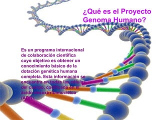 El documento describe el Proyecto Genoma Humano, un programa internacional cuyo objetivo es secuenciar y mapear el genoma humano. El proyecto surgió en la década de 1980 y fue impulsado por instituciones estadounidenses en 1990. Su meta principal es identificar los genes humanos y determinar la secuencia de las 3 billones de bases de ADN que componen el genoma. El proyecto generó debates éticos sobre la confidencialidad de la información genética y el potencial uso comercial de los descubrimientos.