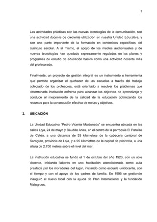 Este proyecto busca mejorar las condiciones de enseñanza-aprendizaje en la Unidad Educativa “Pedro Vicente Maldonado” mediante el desarrollo de habilidades y valores en los estudiantes, con un enfoque intercultural y el uso de tecnologías. Actualmente los estudiantes presentan bajo rendimiento académico, especialmente en matemáticas y lenguaje. El proyecto propone capacitar a los docentes y motivar a los estudiantes para mejorar la calidad educativa a través de experiencias de aprendiz