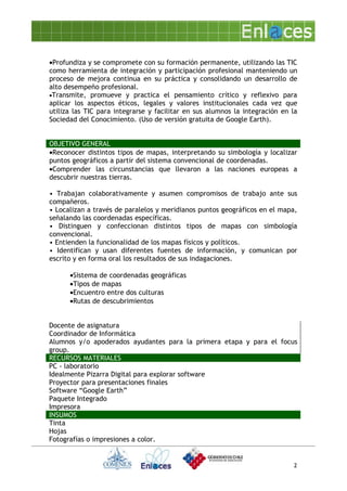 Este proyecto propone el uso de Google Earth para que estudiantes de 3er año exploren y analicen el relieve terrestre, lugares geográficos y obtengan información geográfica. Los estudiantes investigarán las rutas de Colón, Magallanes y otros exploradores y presentarán sus hallazgos. El proyecto consiste en varias etapas como familiarizarse con Google Earth, realizar actividades de exploración y un webquest sobre los viajes de descubrimiento.