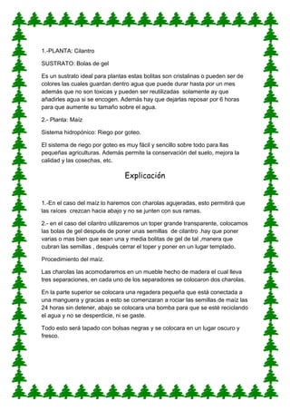 Este documento describe un proyecto de agricultura hidropónica para cultivar maíz y cilantro. El proyecto utilizará charolas agujeradas para cultivar maíz con riego por goteo y bolas de gel para cultivar cilantro. Se estima un costo total de $275 para materiales e insumos y un ingreso inicial esperado de $600. El proyecto está dirigido al público en general y áreas como San Pablo, Ecatepec y Tultitlan. Seis personas formarán parte del equipo con funciones como ventas, administración,