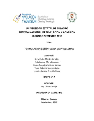 Este documento presenta un proyecto de investigación sobre la formulación estratégica de problemas realizado por 5 estudiantes de ingeniería en marketing. El proyecto contiene 3 capítulos que describen los componentes de la problemática, analizan diferentes tipos de problemas y presentan conclusiones y recomendaciones.